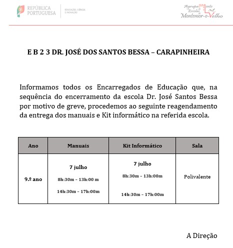 Devolução dos Manuais Escolares e Kit Informático Apresenta-se a nova calendarização referente ao processo de devolução de manuais escolares e kits informáticos. Considerações a ter em conta aemontemor Postagem anterior Os Desafios na Transição de Ciclo Ação de Formação para Pais/Encarregados de Educação 27 de Junho, 2025 Próxima postagem Época de Recuperação Modular de Julho 30 de Junho, 2025 Você também pode gostar AEMOV lança projeto “Monitores da Biblioteca Escolar” para alunos do Secundário 2 de Dezembro, 2025 Agrupamento celebra o Dia Nacional da Cultura Científica 2 de Dezembro, 2025 Estudantes do AEMOV celebram Inês de Castro na BMAD 27 de Novembro, 2025