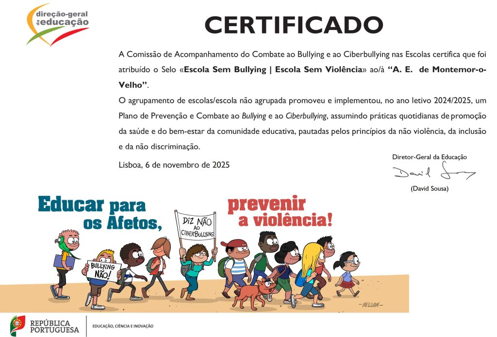 O Agrupamento de Escolas de Montemor-o-Velho foi oficialmente distinguido com o Selo “Escola Sem Bullying | Escola Sem Violência” pela Direção-Geral da Educação, reconhecendo o trabalho desenvolvido no âmbito do Plano de Prevenção e Combate ao Bullying e ao Ciberbullying durante o ano letivo 2024/2025.